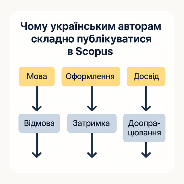 Несмотря на высокий интерес к международным публикациям, многим украинским авторам путь в Scopus кажется слишком сложным. Причина не только в высоких требованиях журналов, но и в ряде дополнительных барьеров — языковых, технических и организационных. Для молодых исследователей это часто становится серьёзным препятствием. Понимание этих трудностей помогает лучше подготовиться и повысить собственные шансы на успех.